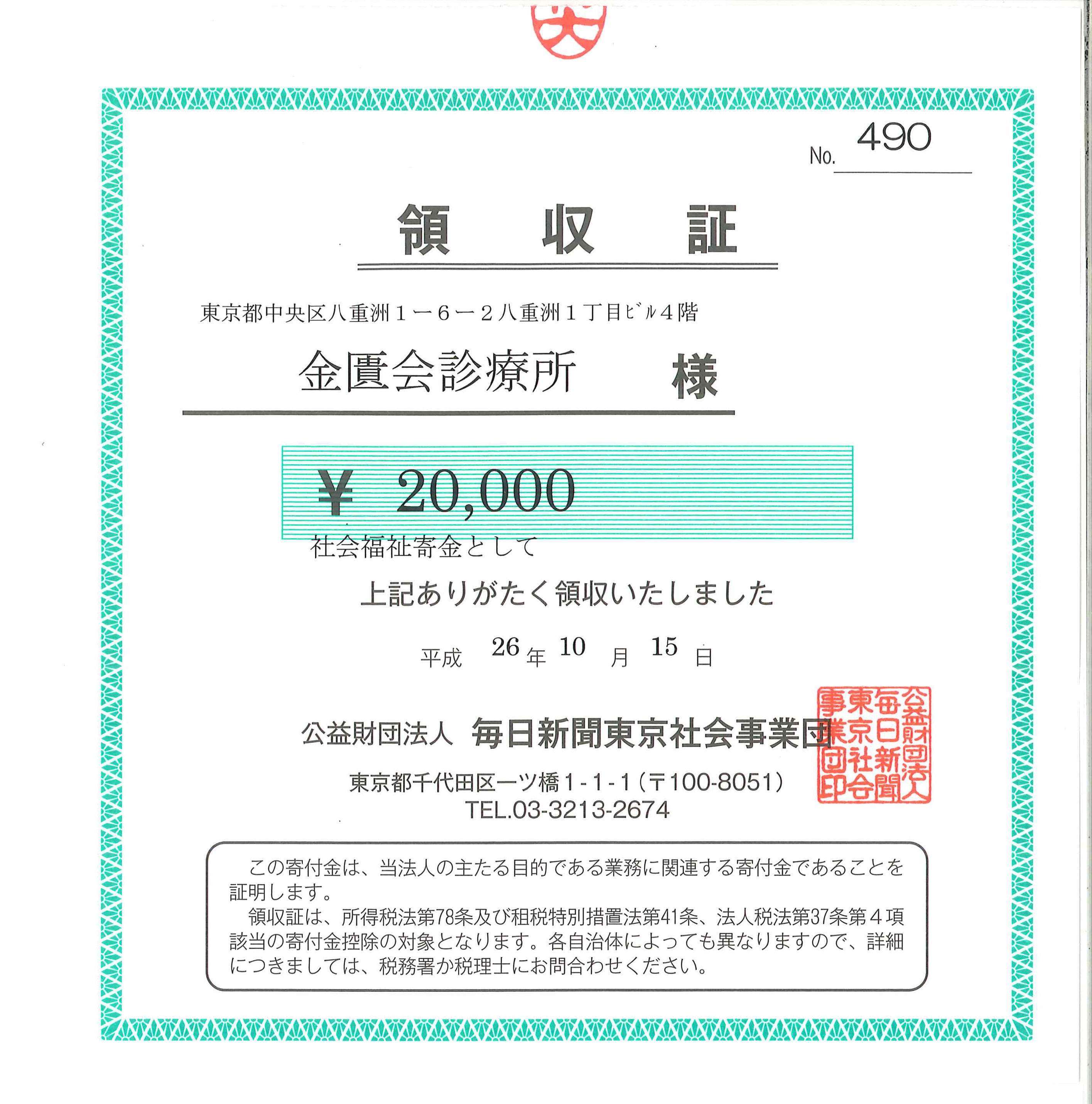 今回も20,000円を毎日希望奨学金へ寄付させて頂きました。