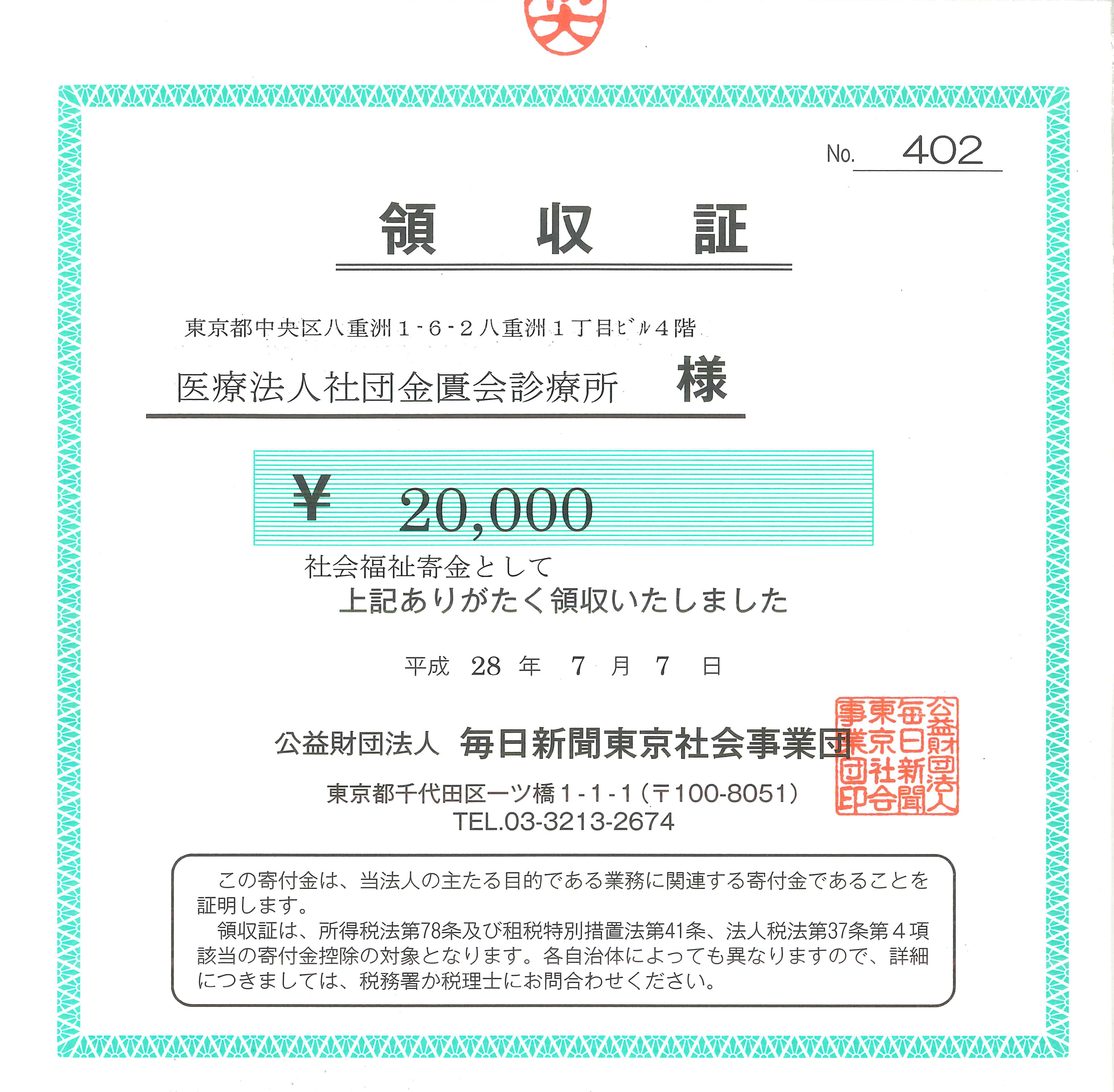 今回も毎日希望奨学金へ20,000円を寄付致しました。